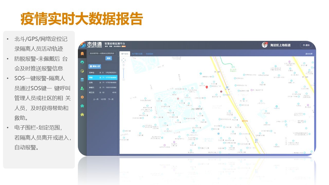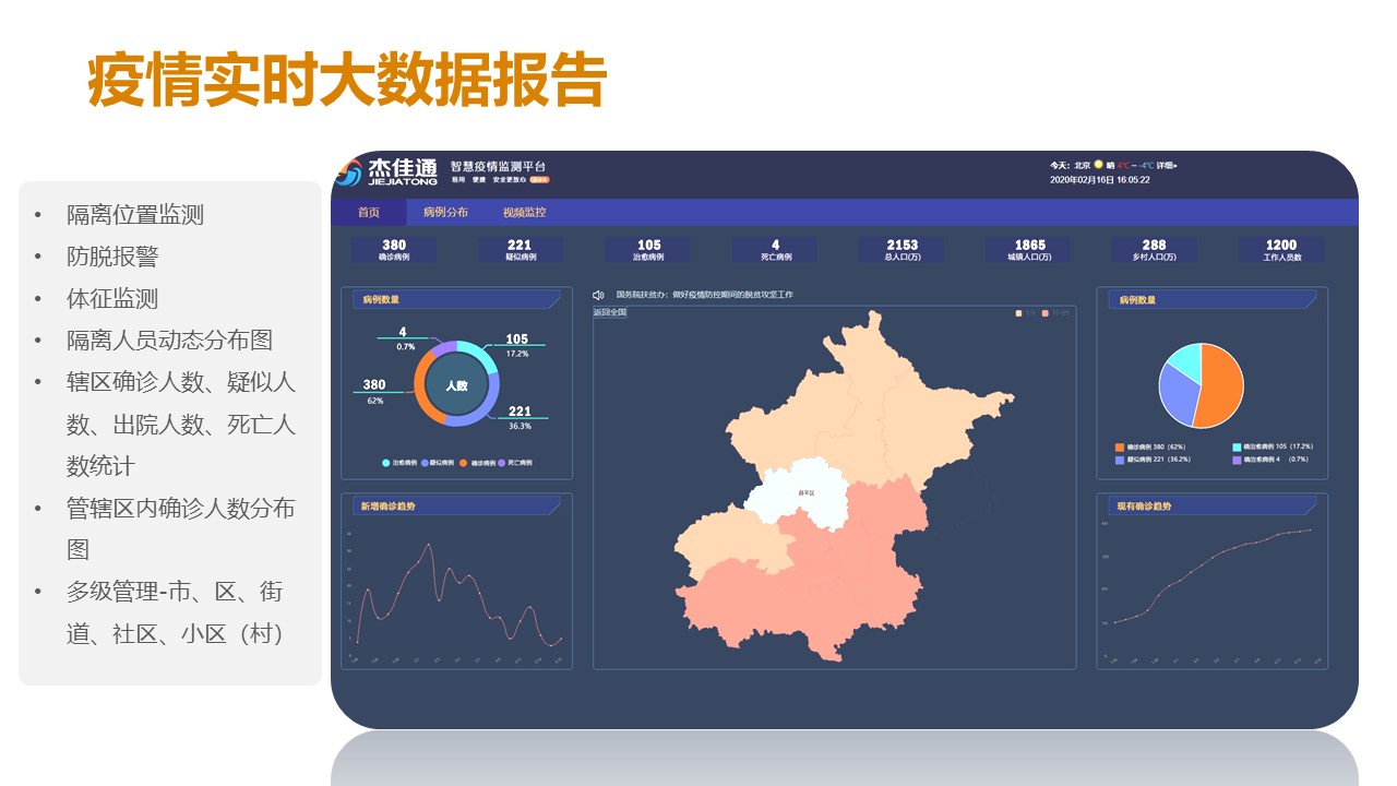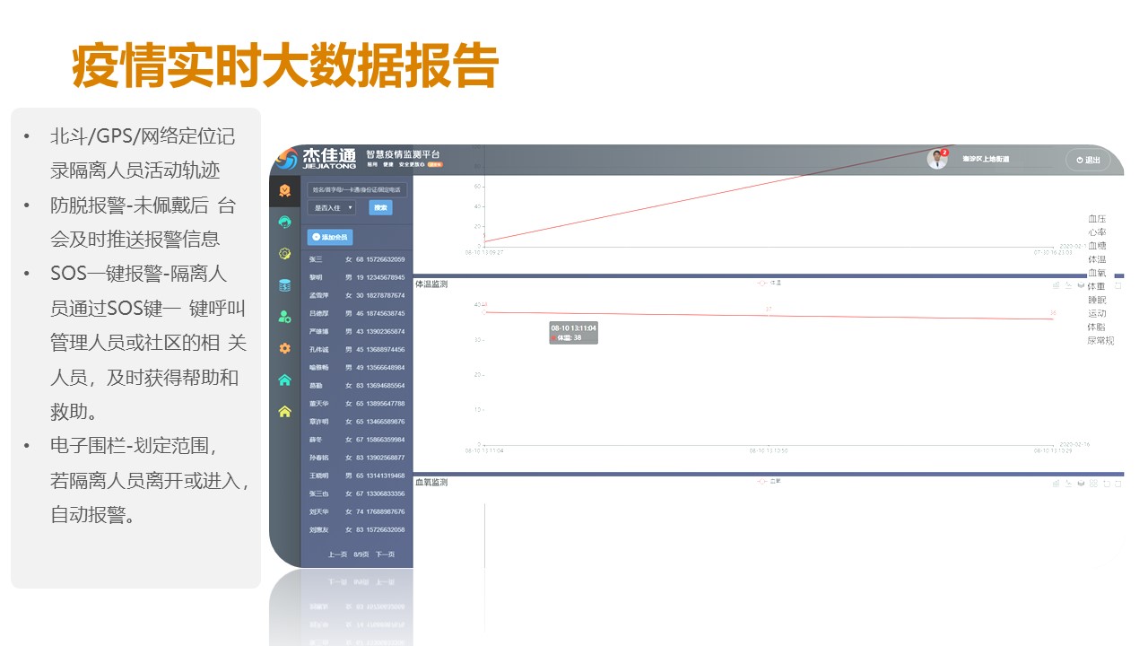 非典之后的又一重大疫情-新型冠狀病毒,它不僅具有很強的傳染性,而且更“狡猾”,隨著全國復工潮的到來,給各地防疫帶來了前所未有的壓力。為了防范疫情擴散,協助政府做好疫情防控,杰佳通把多年智慧養老平臺研發的經驗提煉出來,研發出智慧疫情防控平臺,平臺通過智能終端對進入社區、大廈等場所人員體溫、血氧飽和度自動匯入平臺,而且可以對隔離人員佩戴智能身體監測設備,即時監測隔離人員的行動軌跡、健康參數等,能準確追蹤潛在確診人員的活動軌跡,確定密切接觸者,養老機構入駐對象為易感人群,如何做好養老機構的疫情管理,本章節重點介紹,智慧健康養老平臺中疫情管理部分。